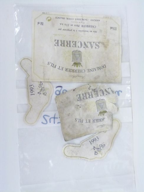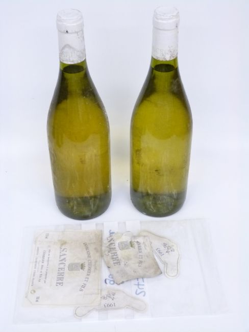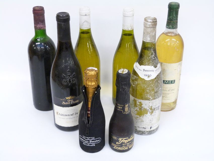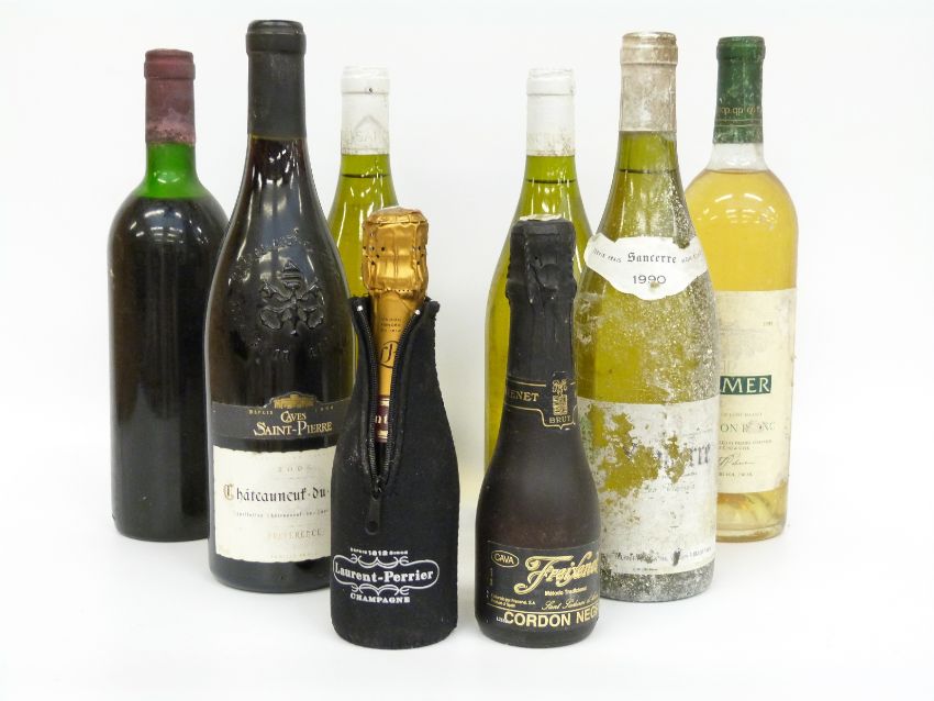 Six bottles of wine comprising three bottles of Sancerre circa 1990 and 1993, Caves Saint-Pierre 2005 Chateauneuf de Pape, Palmer Vineyards (New York) 1992 Sauvignon Blanc all 75cl, Laurent-Perrier Champagne 20cl and a 20cl bottle of Spanish sparkling wine