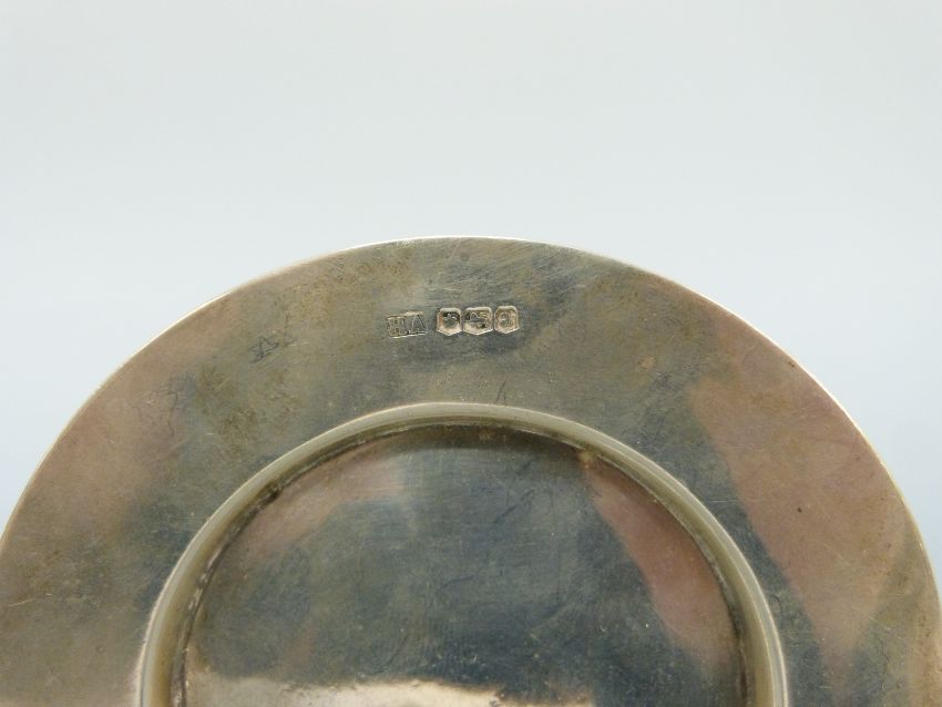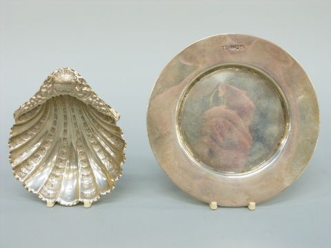 A hallmarked silver calling card tray, diameter 12cm and a shell shaped footed bonbon dish, Sheffield 1918 and 1889 respectively, maker Atkin Brothers, weight 103g