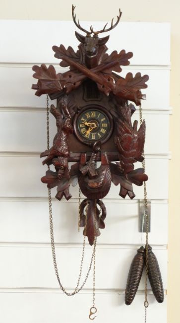 A circa mid 20thC Black Forest carved cuckoo clock in hunting style, with oak leaf pendulum bob and pine cone weight