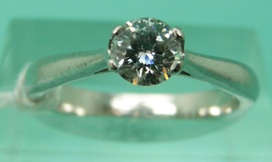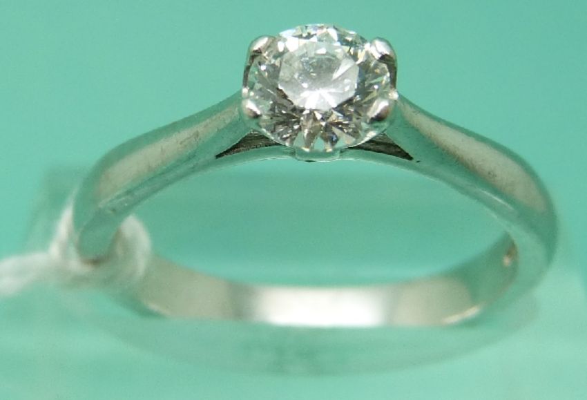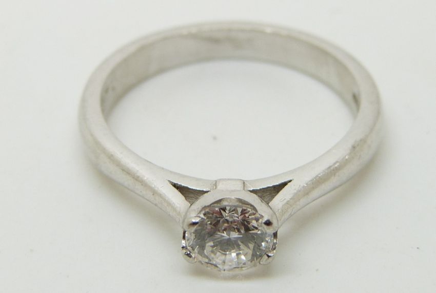 A platinum ring set with a modern round brilliant cut diamond measuring 0.5ct, with GIA certificate and original box (size M)