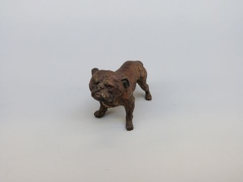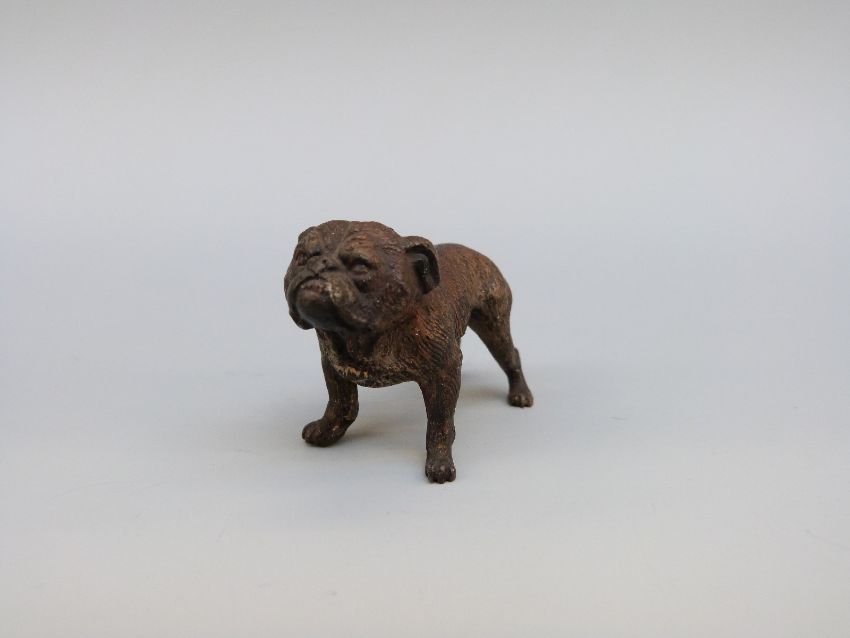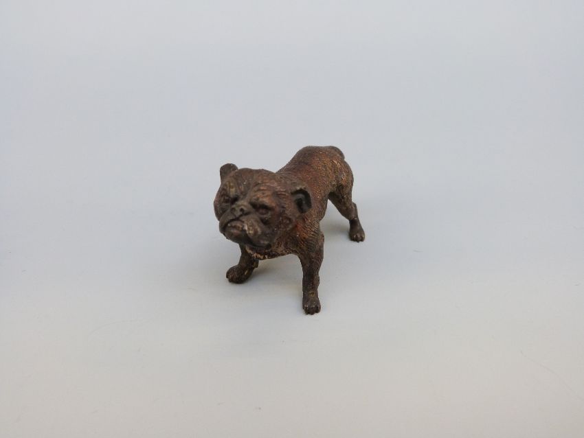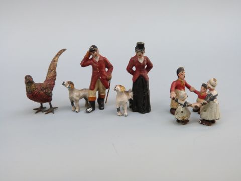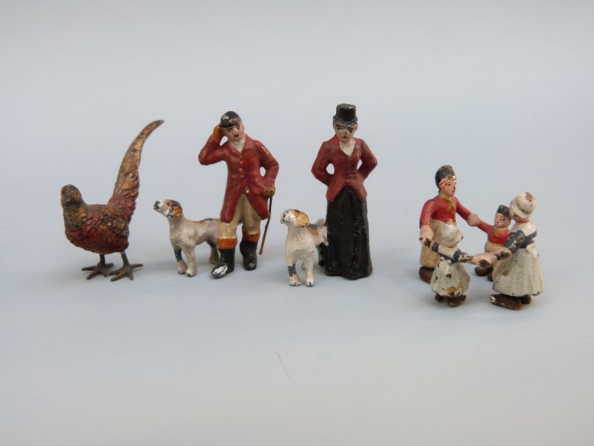 A collection of late 19thC / 20thC cold painted bronze and other miniature metal figures including a bulldog, ring a roses group, Beatrix Potter figures, huntsmen and women with hound, pheasant etc, largest 3cm