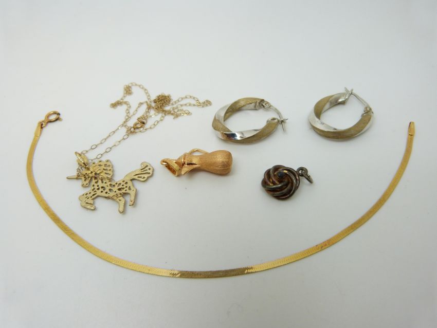 A 9ct gold necklace and pendant in the form of a unicorn, a 9ct gold bracelet, a pair of 9ct gold earrings (4.3g) and an 18ct gold charm (1.16g)