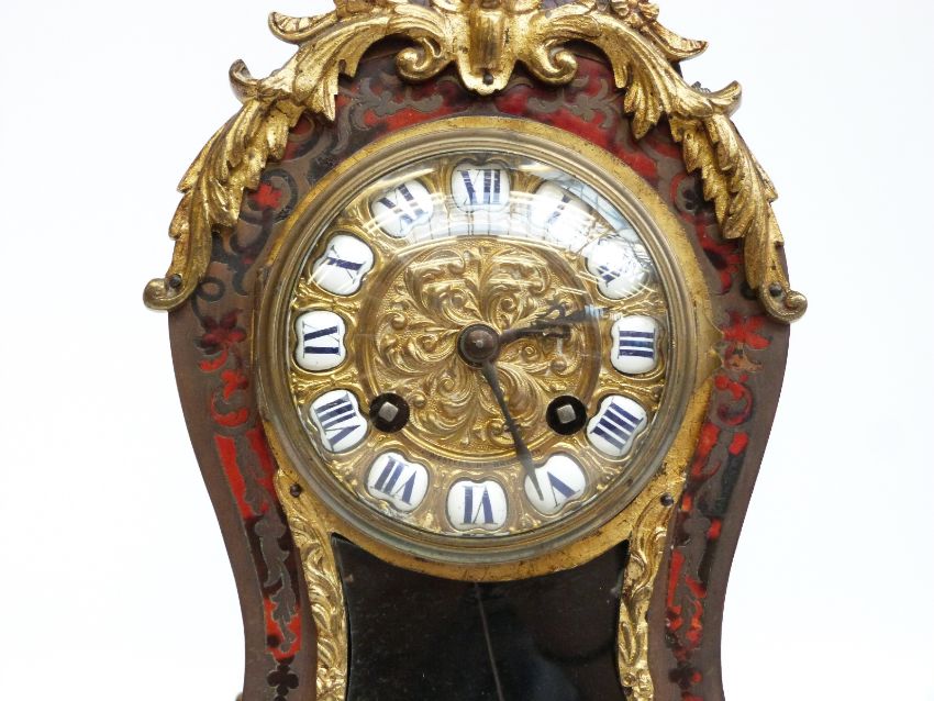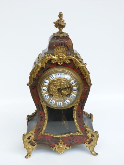 A mid to late 19thC Louis XIV style boulle work mantel clock with ormulu mounts, enamelled Roman numerals and beetle and poker hands, the two train movement number OR 86275, 'Sun King' pendulum bob, retailer to dial Lewis, 32 Western Rd, Bright, label to inside door