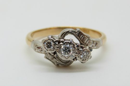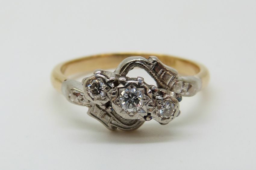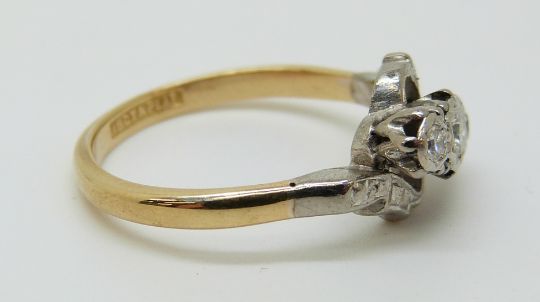 An 18ct gold ring set with three diamonds in a platinum setting (size P)