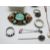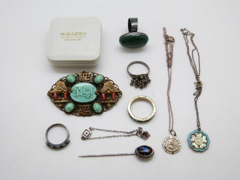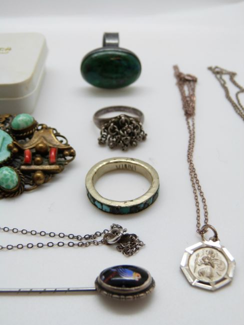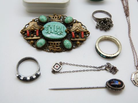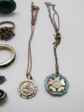 A silver necklace set with a mother-of-pearl flower and blue enamel, silver rings, Chinese brooch etc