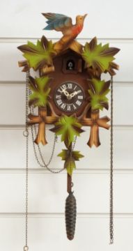 A mid to late 20thC cuckoo clock with painted vine leaf case decoration and pine comb weight