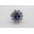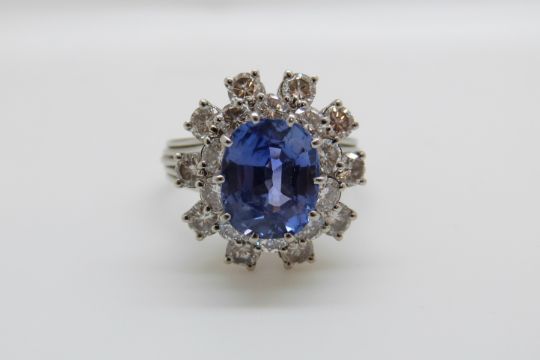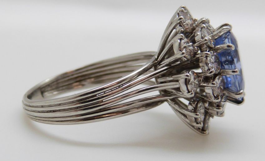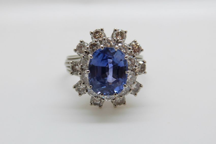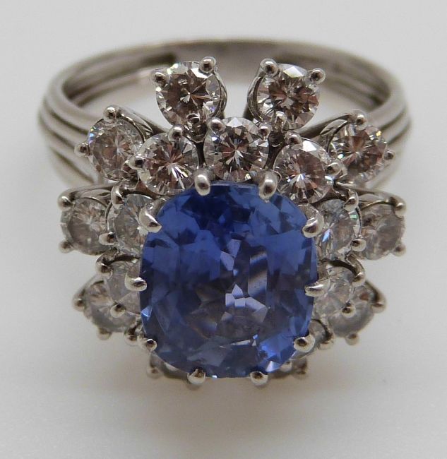 A platinum ring set with a cushion cut cornflower blue sapphire of approximately 5.65ct surrounded by round brilliant cut diamonds each measuring approximately 0.15ct (size P/Q)