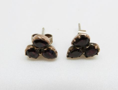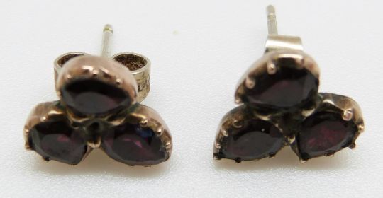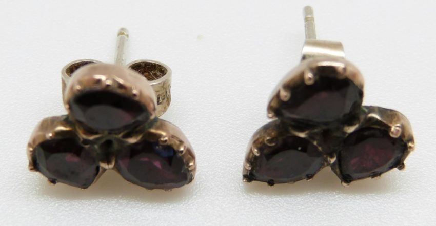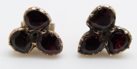 A pair of early Victorian earrings set with three foiled garnets to each