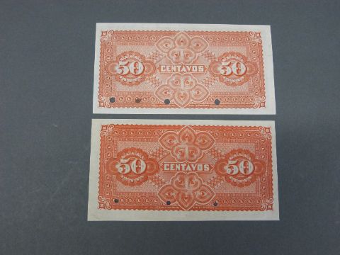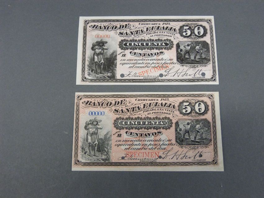 Two Mexico specimen notes 50 Centauos 1875 Ca 1881 S190 series B unc ex Stacks and Bowers