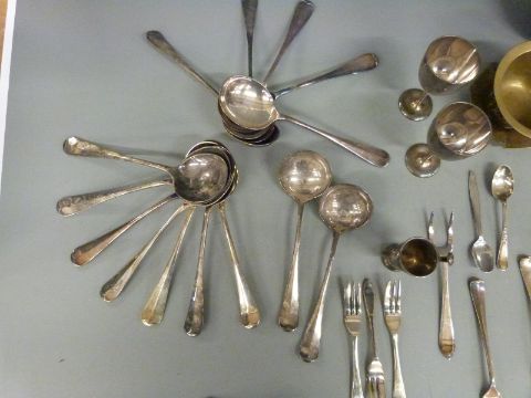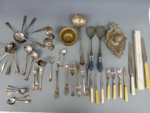 Wedgwood Jasperware plated salad servers, plated cutlery including rat tail pattern, set of soup spoons, brass inkwell etc