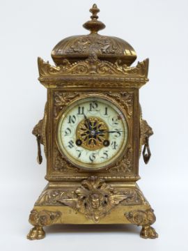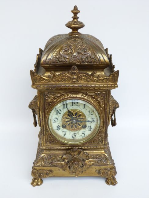 Samuel Marti 19thC brass gilt two train mantel clock, striking on a gong, the lightly decorated case with lion mask handles on either side, the Arabic ivory dial with pierced and chased centre, beetle and poker hands, raised on lion paw feet, 33cm tall