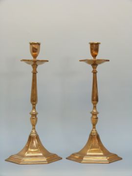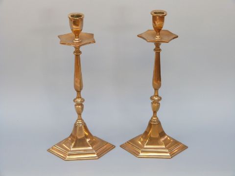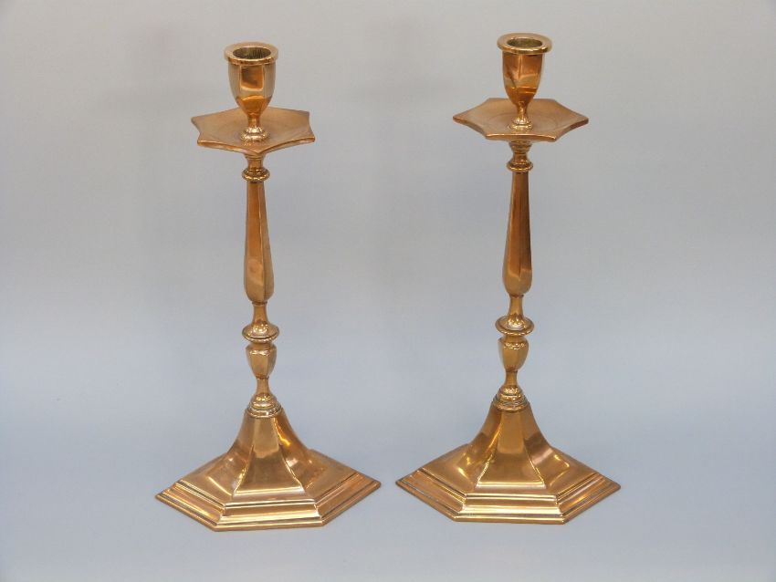 A pair of bronze or similar cast hexagonal candlesticks, H33cm