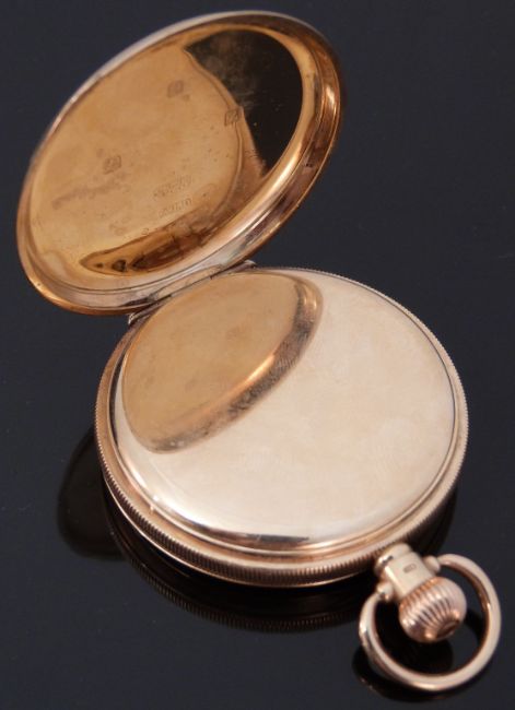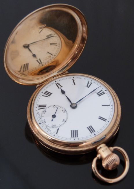 9ct gold gentleman's keyless winding full hunter pocket watch with Roman numerals, secondary seconds dial and blued hands, case diameter 49mm, 82.2g