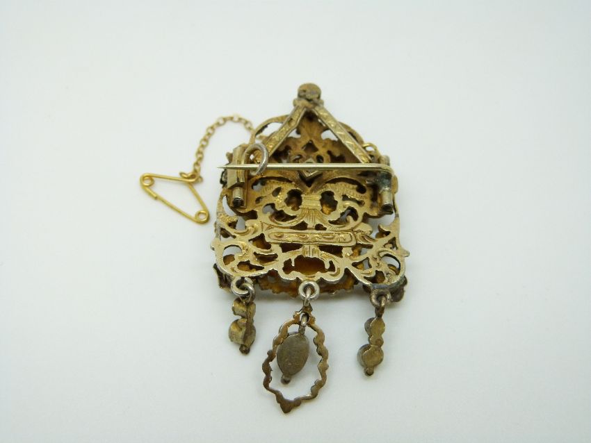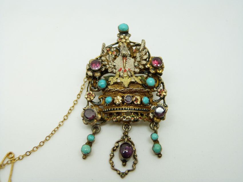 A c1860 Austro-Hungarian silver gilt brooch in the form of a stylised crown, with a swan and its young on the nest to the centre surrounded by scrolling foliate design, the whole set with turquoise and garnets, 2.9 x 5.5cm