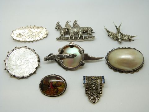 An Edwardian silver brooch with bird and foliate design, a Victorian swallow brooch, three mother of pearl brooches and a goat brooch etc.