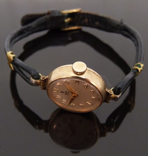 Tudor Royal 9ct gold ladies wristwatch with gold hands and Arabic numerals, on black leather strap, case diameter 20mm.