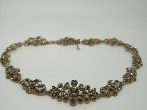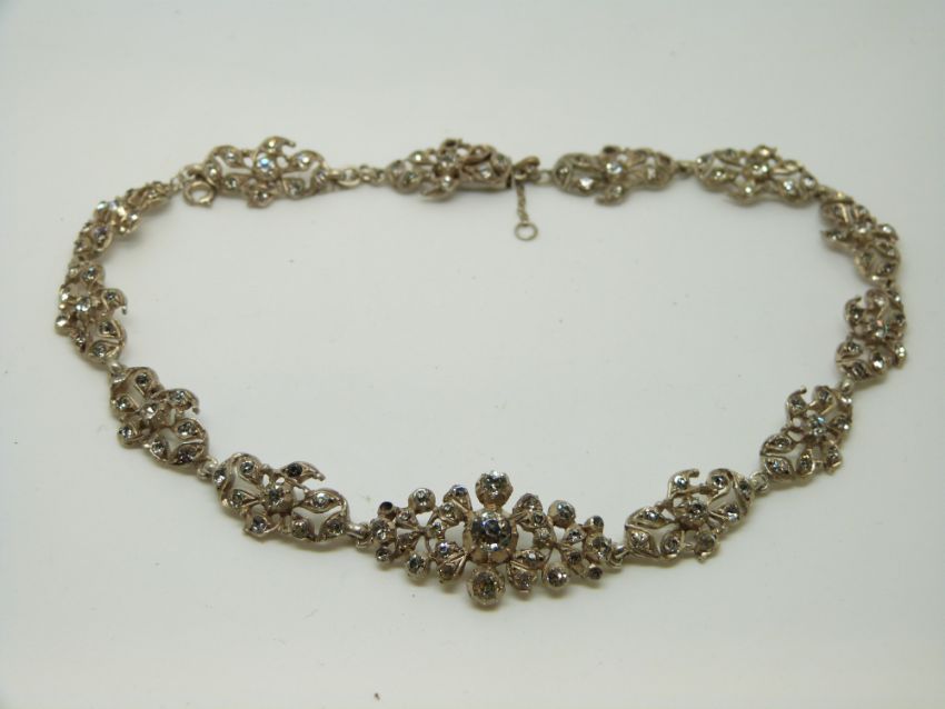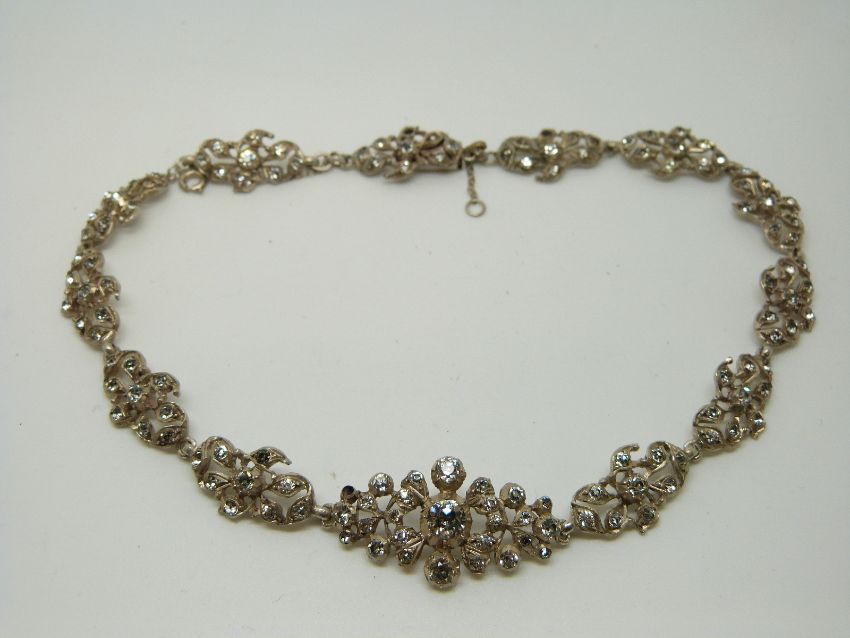 An early 20thC white metal necklace of floral design set with foiled paste