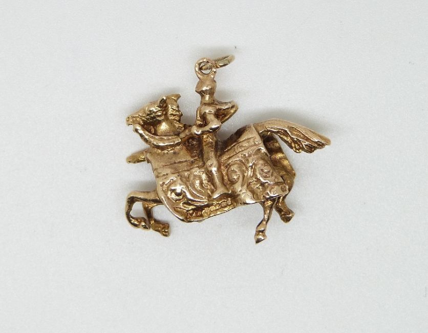 A 9ct gold charm/ pendant set with knight on a horse, 6.8g