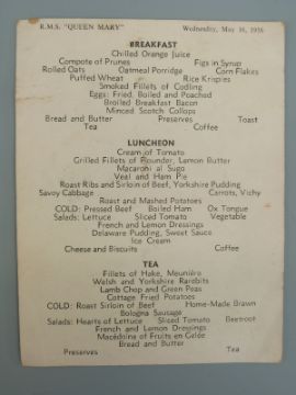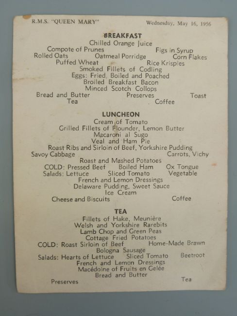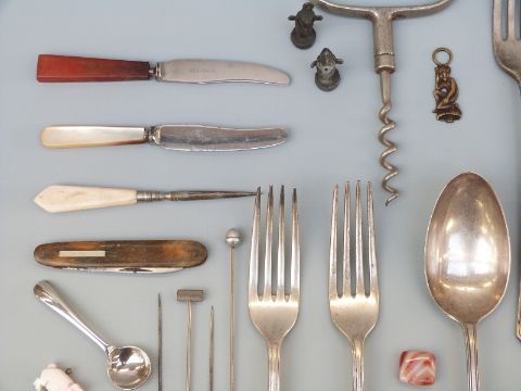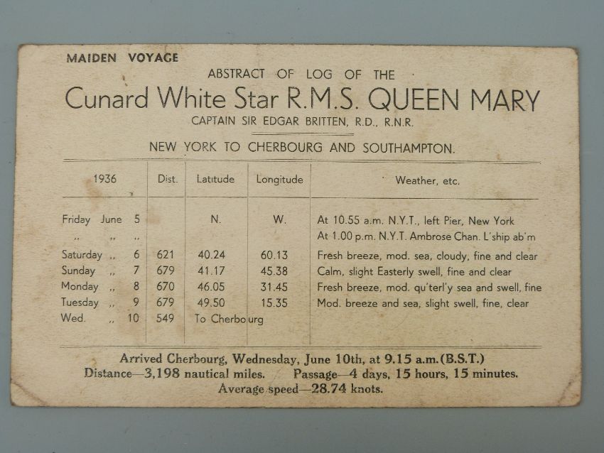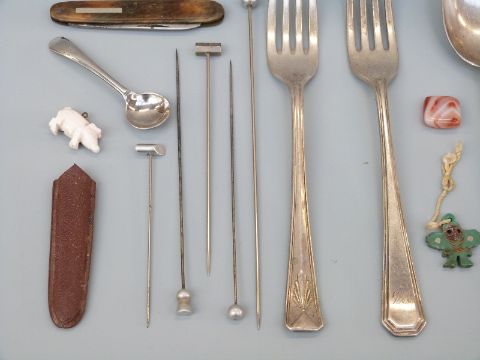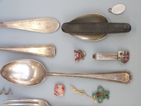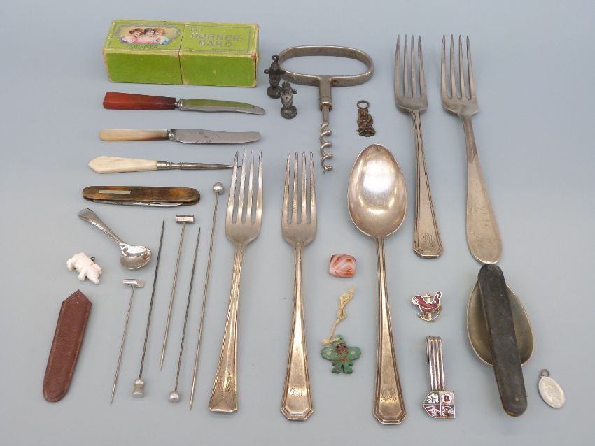Hallmarked silver cutlery with English and continental marks, a corkscrew, hat pins, badges, Cunard White Star Queen Mary maiden voyage postcard, 1956 menu and a cloth backed Daily Telegraph war map