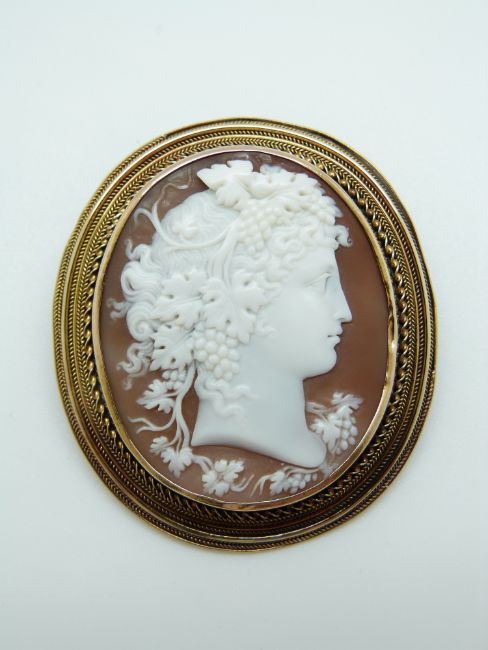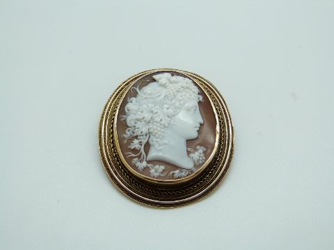 A Victorian brooch set with a large cameo within a rope twist and textured border, 4.7cm