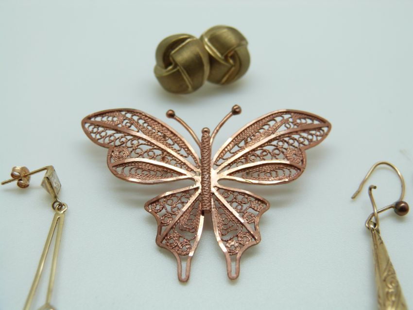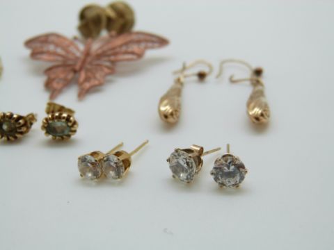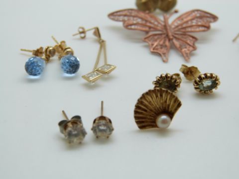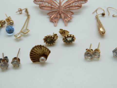 A 9ct gold filigree butterfly (3.1g), a pair of 14ct gold earrings, a pair of 18ct gold studs set with cubic zirconia, a pair of 9ct gold earrings set with blue topaz etc (10g)
