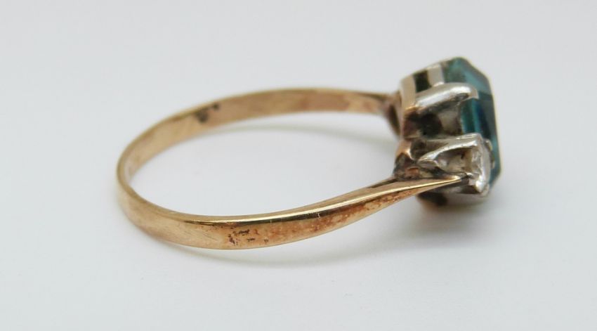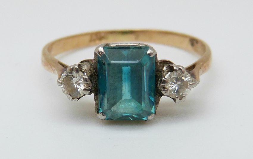 An 18ct gold ring set with an emerald cut blue topaz and two diamonds (size K)