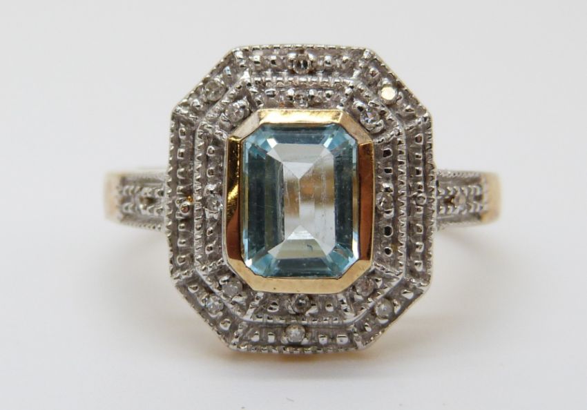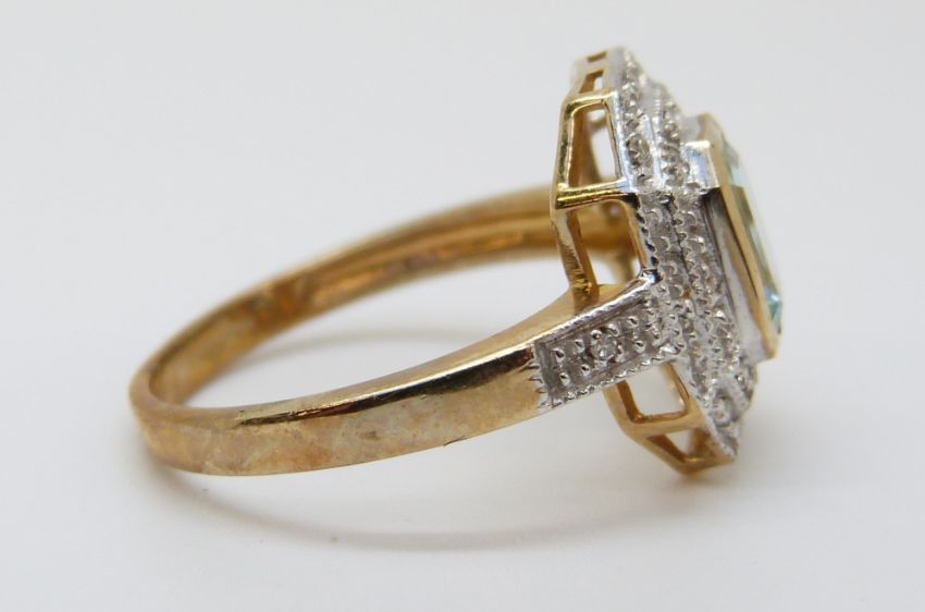 A 9ct gold ring set with a topaz surrounded by diamonds in a rectangular setting (size M)