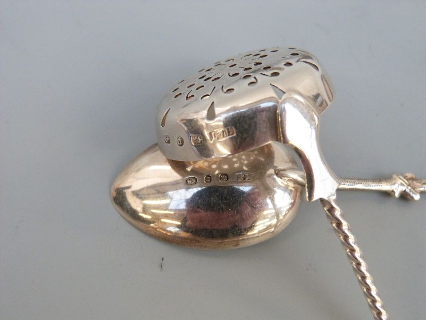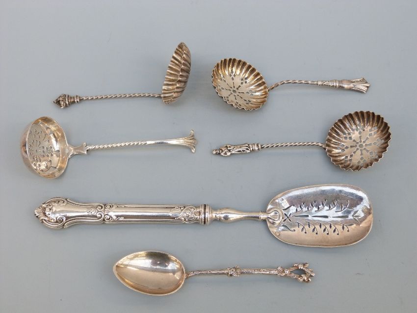 Four Victorian and later hallmarked silver sifter spoons, one Birmingham 1890, two 1896 and one 1907, each approximately 10cm, a silver teaspoon with twig handle, weight 48g and a French white metal sifter spoon, maker's mark CB, length 18cm