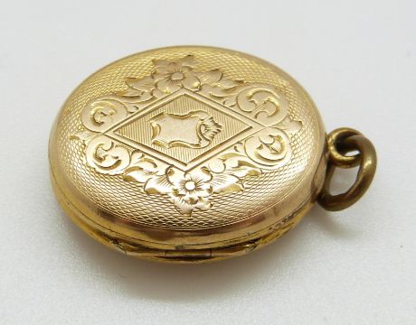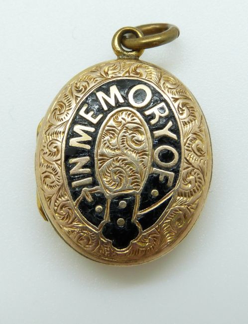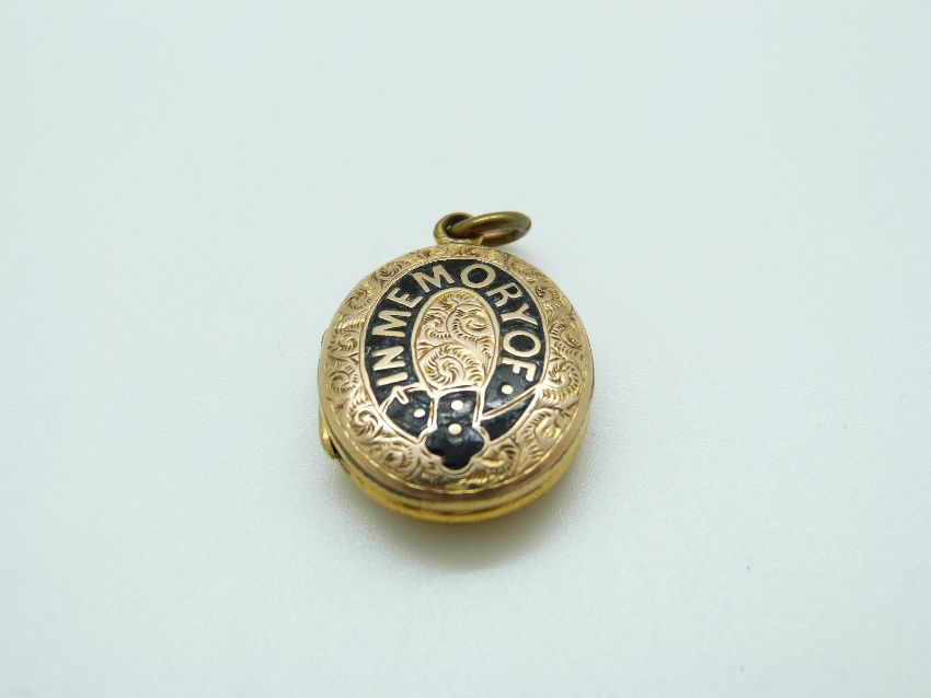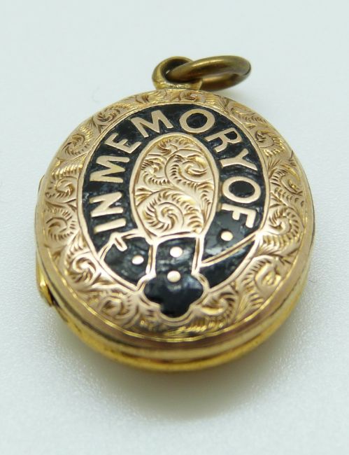 A Victorian locket reading 'In memory of' in black enamel with chased foliate design