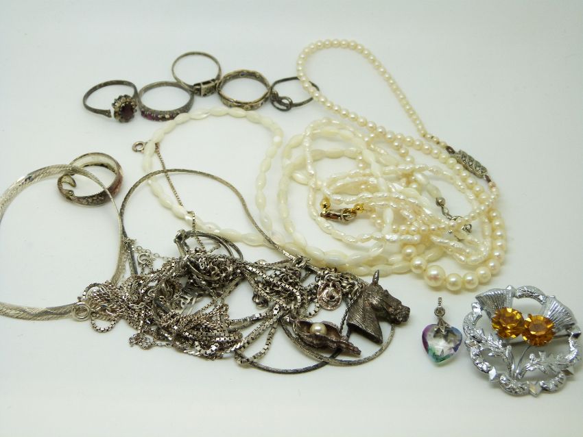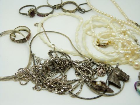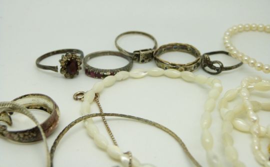 A collection of silver jewellery to include necklaces, pearl necklaces, silver rings, silver bracelet etc.
