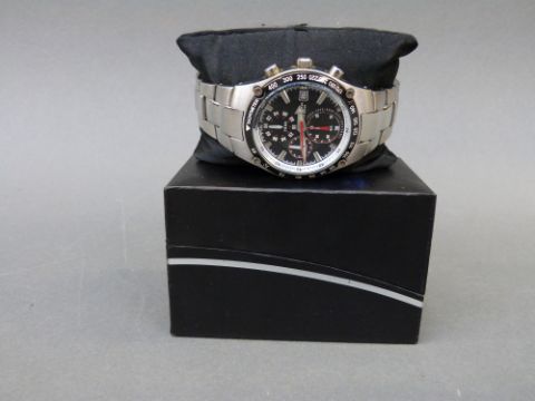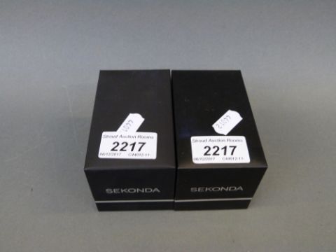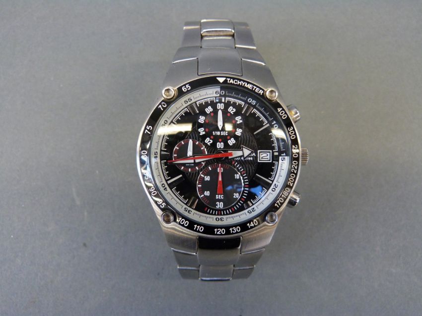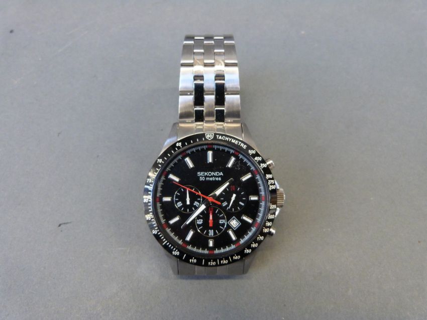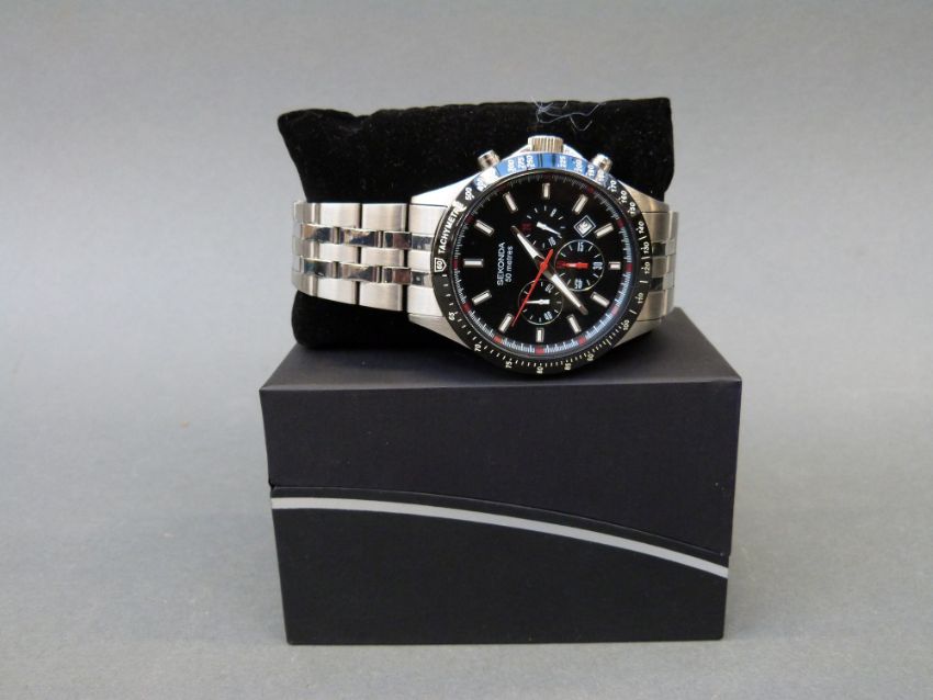 Two Sekonda gentleman's chronograph wristwatches both with luminous hands and markers, black faces, red seconds hands, and tachymetre bezels, on stainless steel bracelets, both in original boxes.