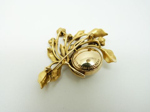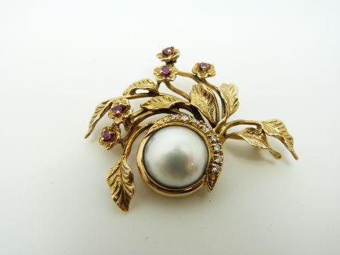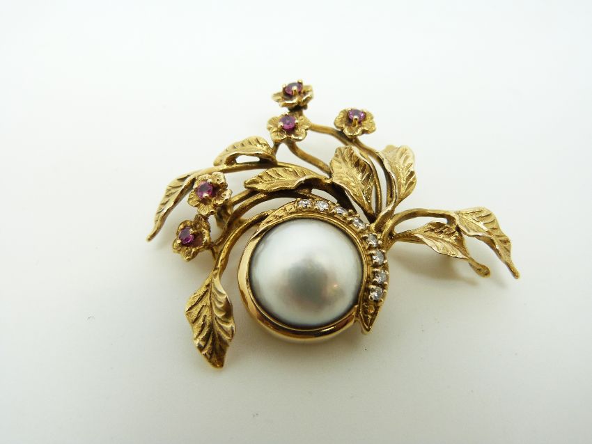 A Givenchy 14k gold brooch set with a central mabe pearl with a crescent of diamonds, surrounded by foliate and floral decoration, the flowers set with rubies, 4.5 x 3.3cm