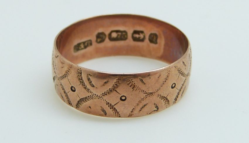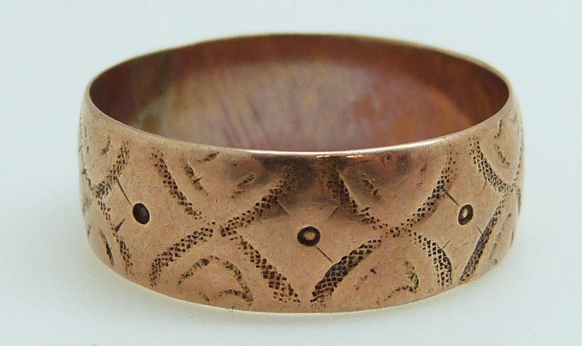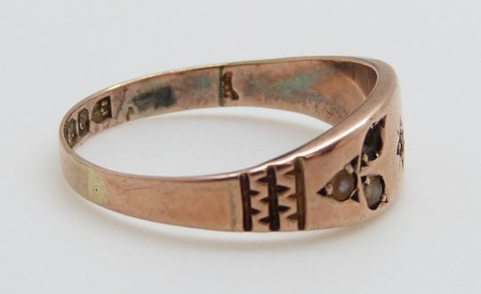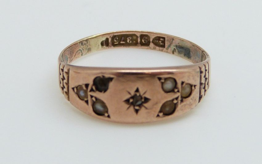 A 9ct gold wedding band and a 9ct gold ring set with seed pearls, 4.2g