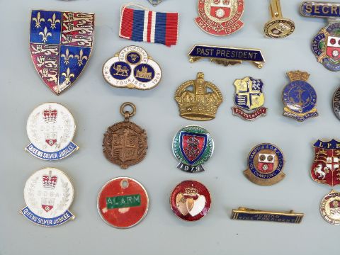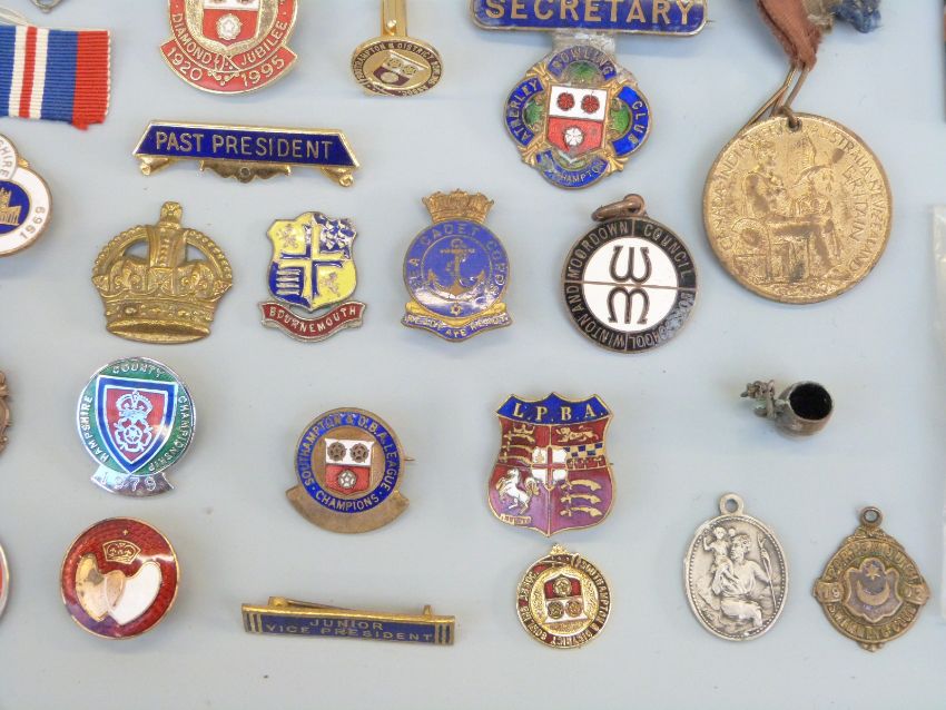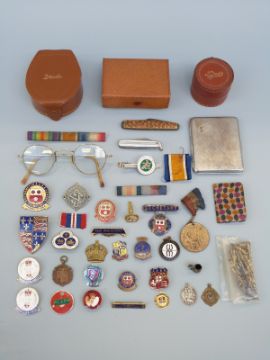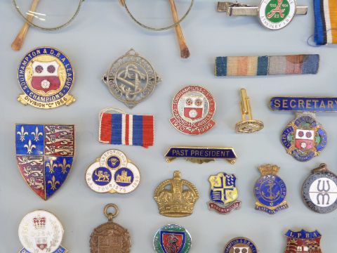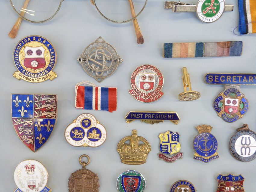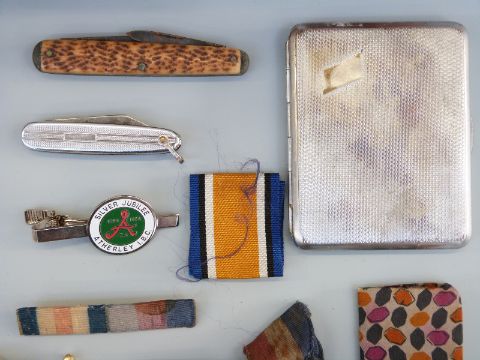 A group of small collectables to include badges, medal bar, pen knives, collar studs, watch chain, clips, tie bars etc