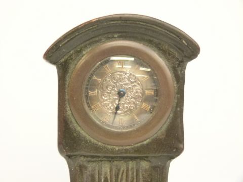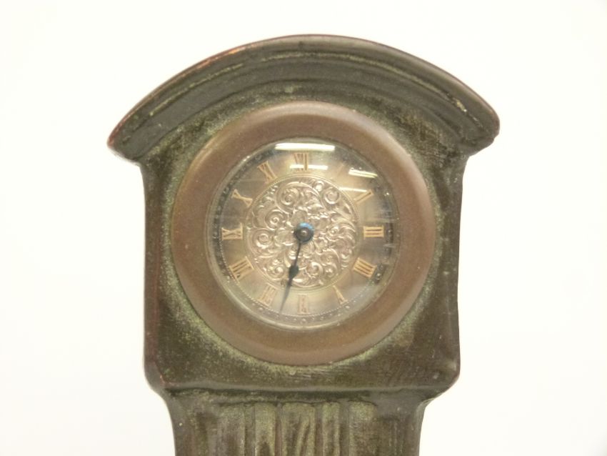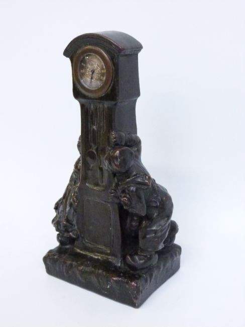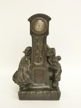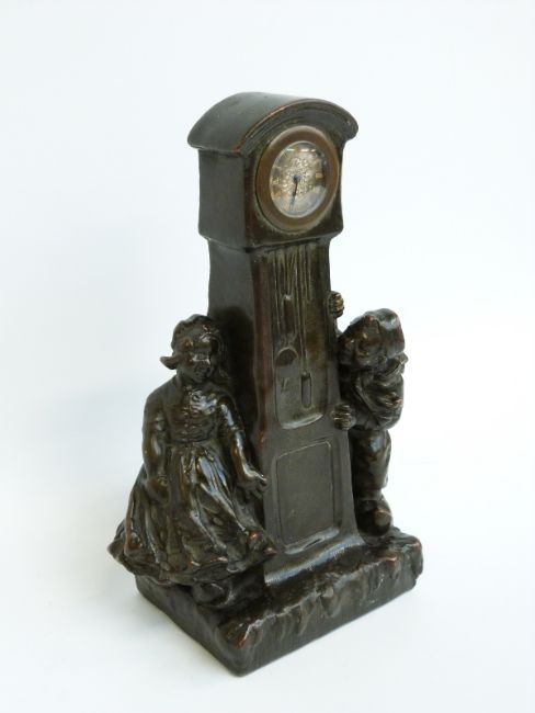 A late 19thC bronze clock/model in the form of a longcased clock and two figures of Dutch children, the silver dial with Roman numerals, signed on the reverse by G Vaerenbergh, 20cm tall