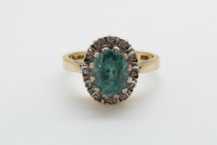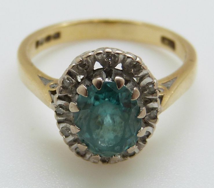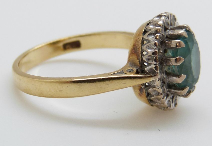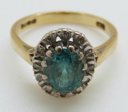 An 18ct gold ring set with a zircon surrounded by diamonds in a platinum setting (size J/K)