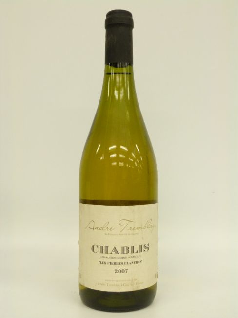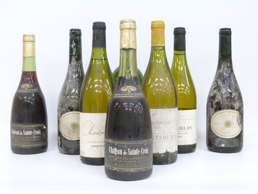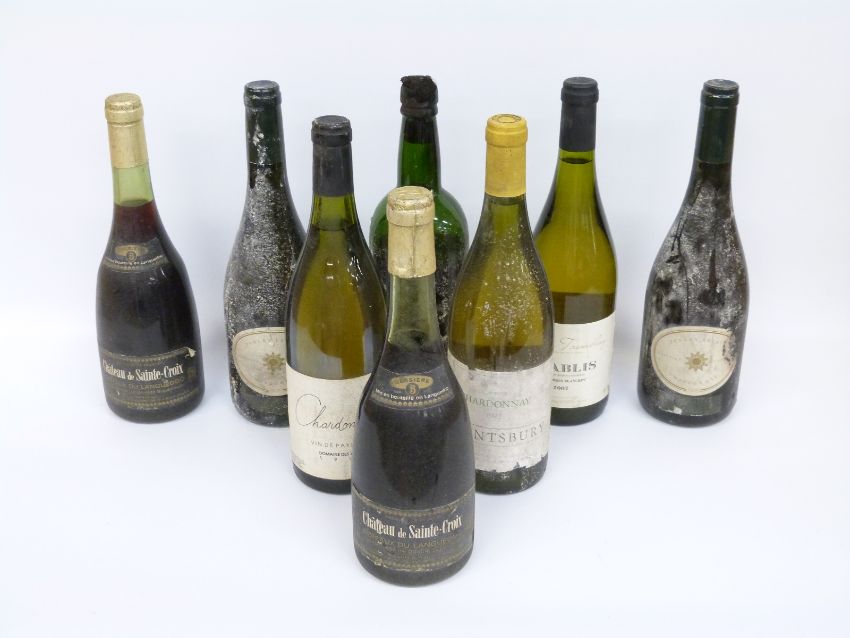 Eight bottles of wine including two bottles of 1977 Chateau de Sainte-Croix Coteaux de Languedoc, two bottles of Penley Estate Chardonnay, two further bottles of Chardonnay, Andre Tremblay Chablis 2007 'Les Pierres Blanches' and an anonymous bottle with no label, mostly 75cl