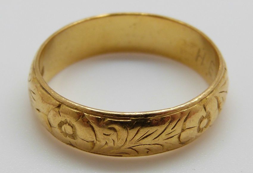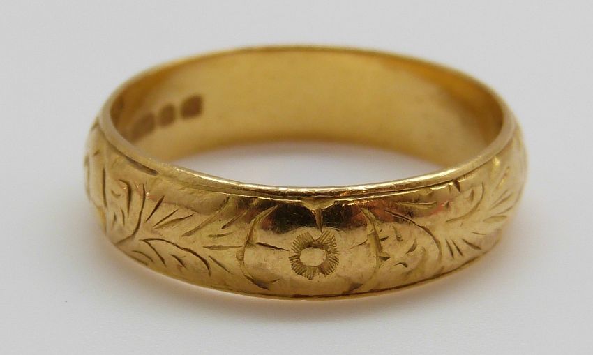 A 22ct gold wedding band with chased decoration, 6.6g (size P/Q)