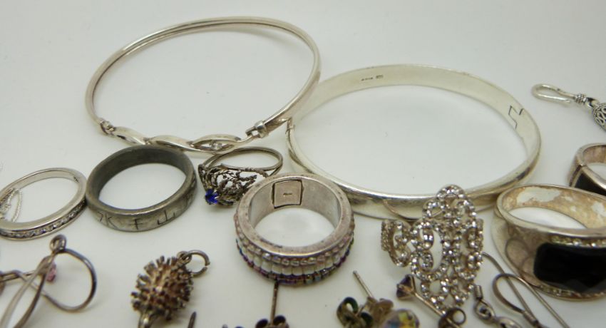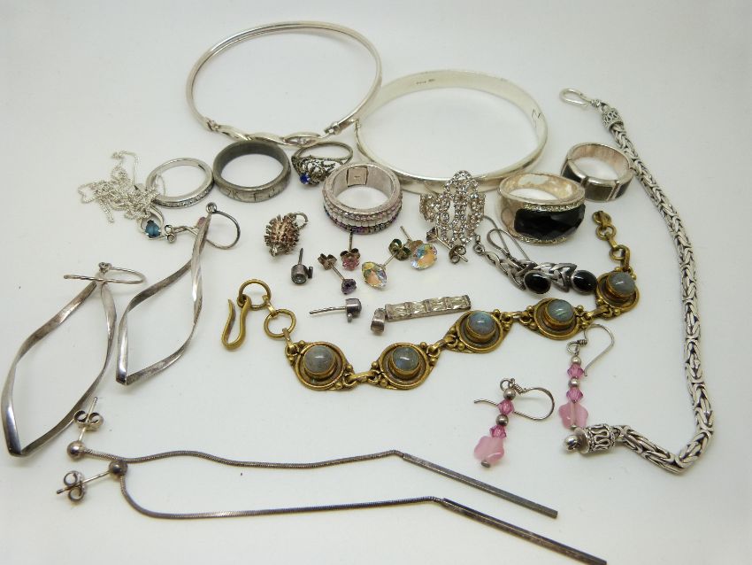 A bracelet set with labradorite cabochons, two silver bracelets, a silver necklace, a silver bangle, silver rings etc