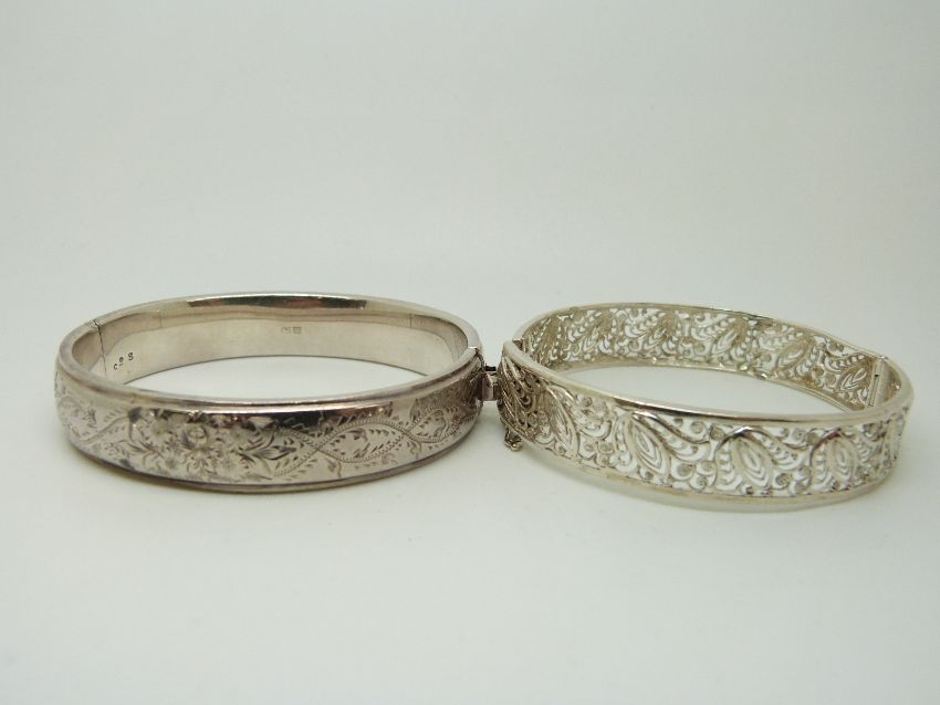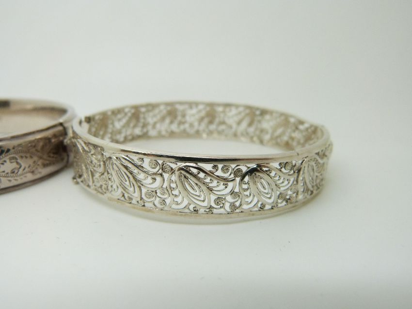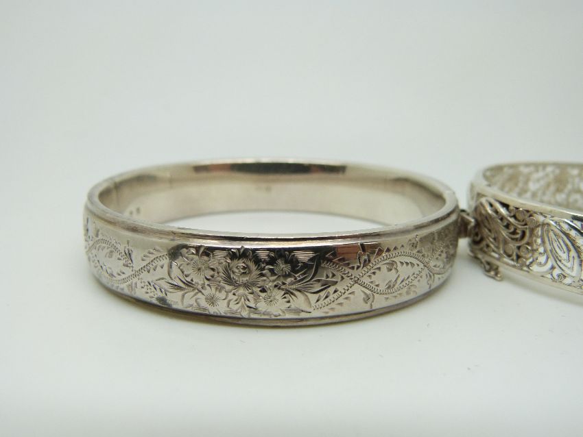A hallmarked silver bangle with engraved foliate decoration and a silver filigree example