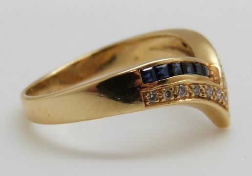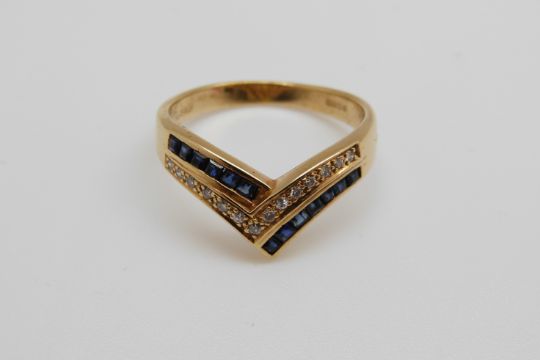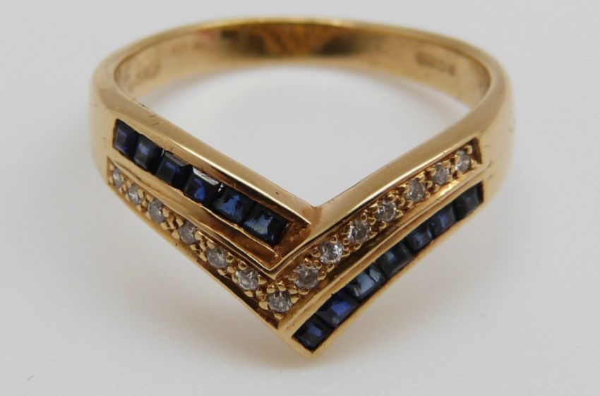 An 18ct gold ring set with square sapphires and diamonds in a V shape (size P)