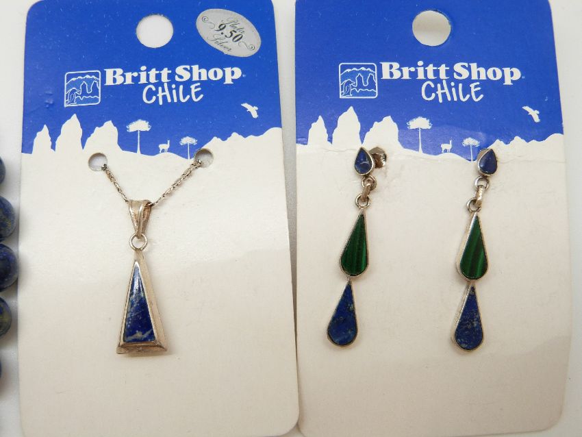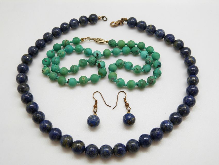 A lapis lazuli beaded necklace, turquoise beaded necklace, 9ct gold necklace, silver necklace and earrings