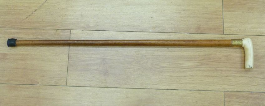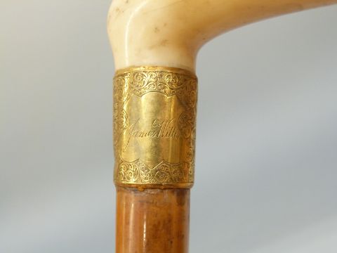 A carved ivory-handled malacca cane with 18ct gold mounts