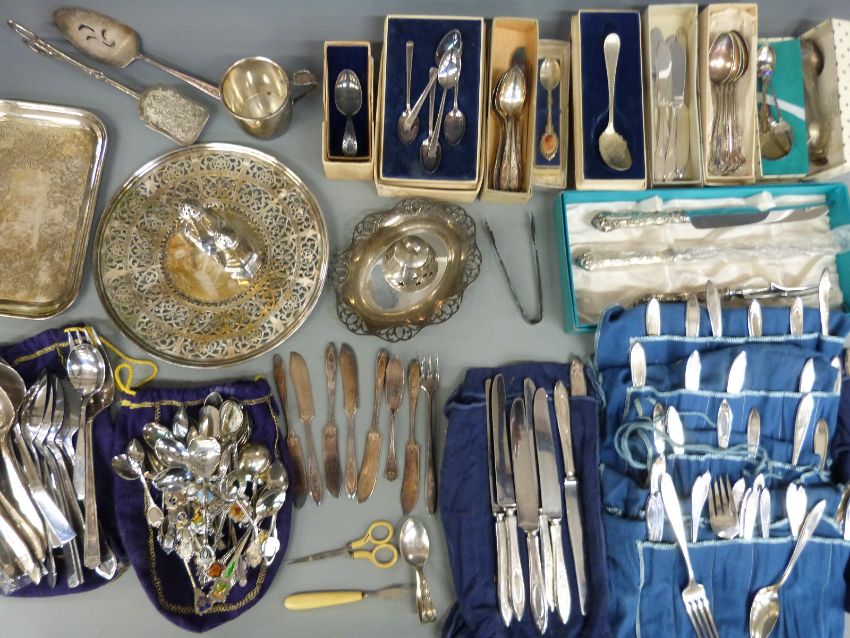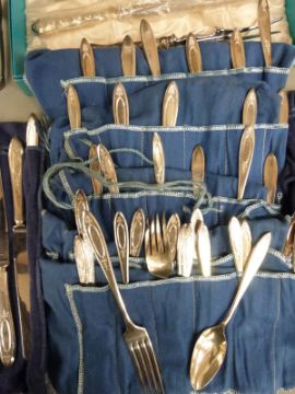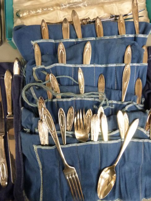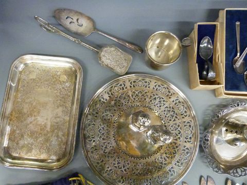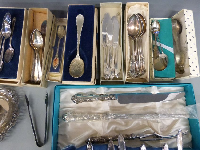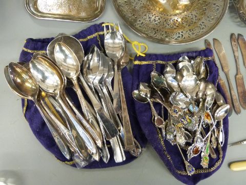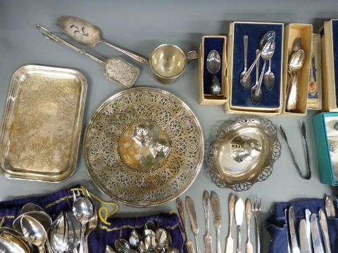 A collection of silver plated ware including cutlery, carving set marked Birks Sterling to handles etc