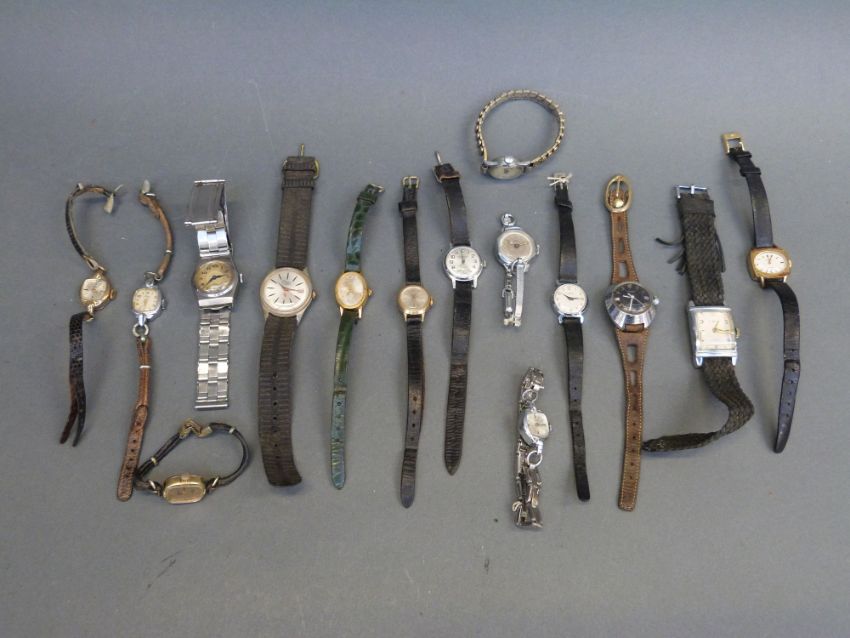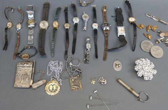 A collection of vintage watches and jewellery including Timex, Rolex style stainless steel wristwatch, Siro, Sekonda, cufflinks, brooches, coins etc.