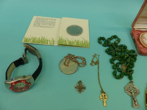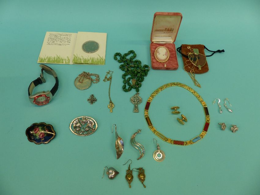 A collection of costume jewellery including a lacquer brooch, silver earrings, rolled gold etc