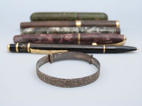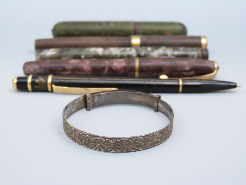Four vintage pens including New Bond Easiflow and Swan and a silver bracelet
