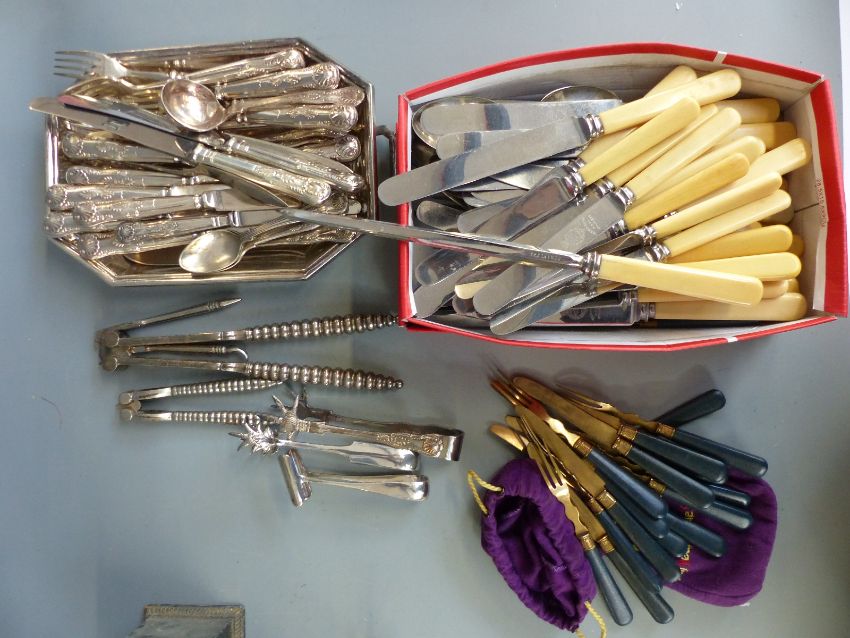 A collection of silver plated cutlery including Kings pattern, Ronson and another lighter, two epergnes etc