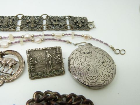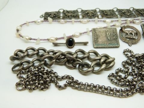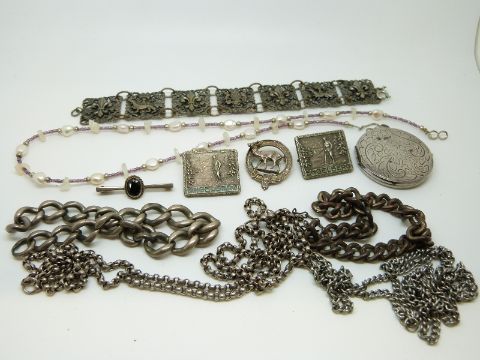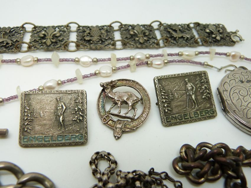 A collection of jewellery to include silver necklaces, silver bracelet, silver brooch, silver locket, skiing brooches etc