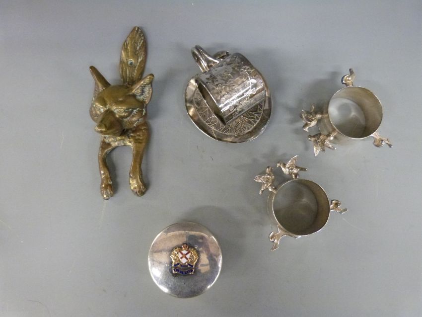 A quantity of metal ware including R.M.S. SS Ohio trinket box, fox door knocker, WMF napkin ring etc.